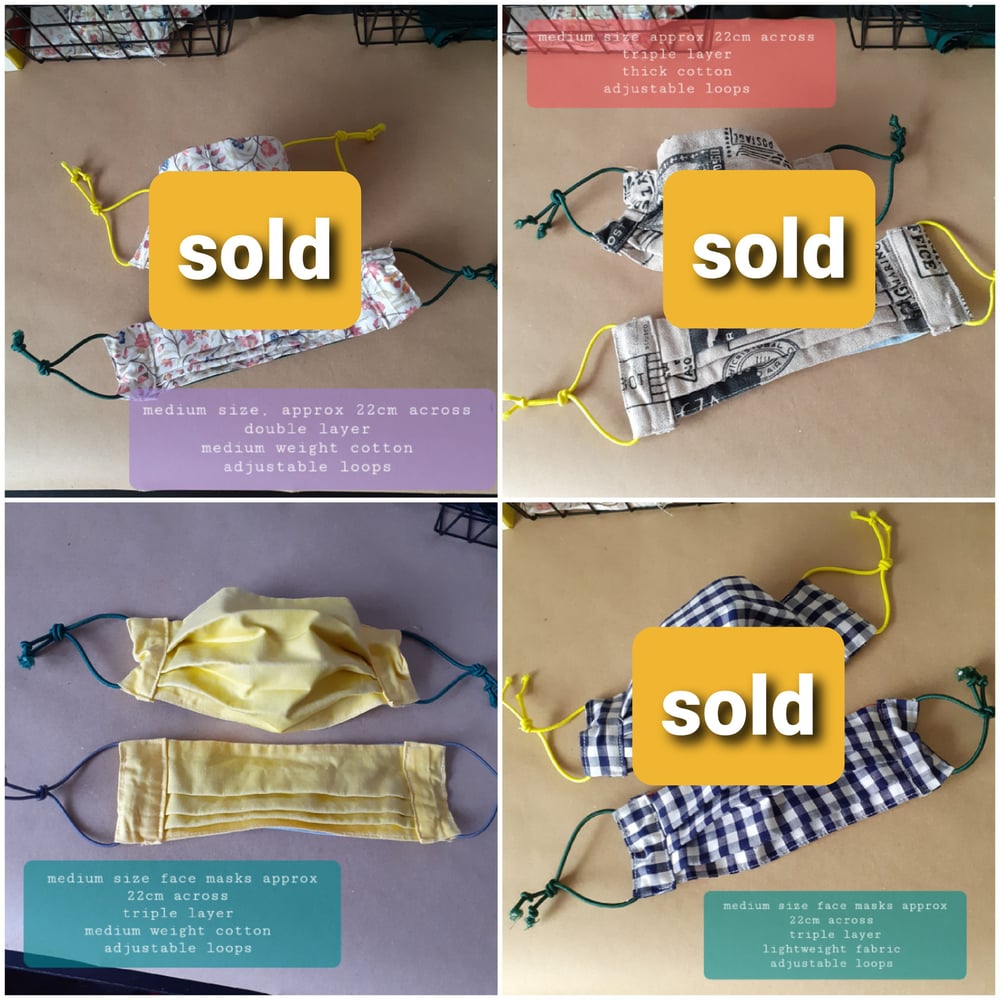 Pair of medium sized face masks, measure approximately 22cm across, and have adjustable elastic ear loops so the sizing is very flexible.